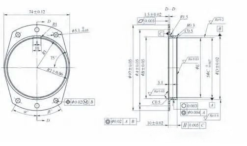圖1為法蘭盤軸承整體結(jié)構(gòu)。法蘭盤是法蘭盤軸承實(shí)現(xiàn)小游隙和自調(diào)心功能的重要零部件,其自身的尺寸精度和幾何公差對整個軸承的使用功能起著決定性作用。法蘭盤內(nèi)球面的加工精度和安裝孔位的定位精度,直接決定了軸承的使用壽命和性能,同時影響裝配后與整個軸承的調(diào)心能力的強(qiáng)弱和偏轉(zhuǎn)力矩的大小。而調(diào)心能力、偏轉(zhuǎn)力矩和游隙大小直接影響組件功能的實(shí)現(xiàn)。為了滿足法蘭盤軸承的整體功能需求,提高自身精度等級,設(shè)計(jì)人員對法蘭盤的機(jī)械加工提出了更加嚴(yán)苛的要求。