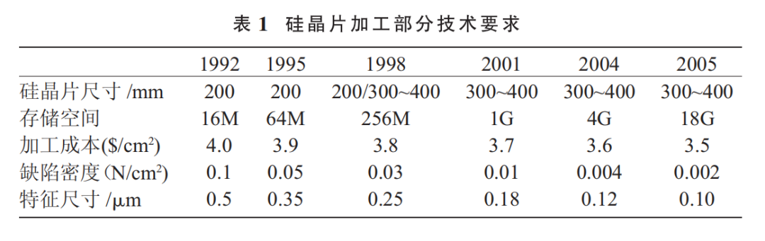 另外,在現(xiàn)代國(guó)防和軍事方面,電子信息化武裝的武器裝備在現(xiàn)代戰(zhàn)爭(zhēng)中發(fā)揮著越來(lái)越重要的作用,甚至起著決定戰(zhàn)爭(zhēng)勝負(fù)的關(guān)鍵性作用。所有這一切的發(fā)展和需要,都是建立在半導(dǎo)體硅材料的基礎(chǔ)之上。半導(dǎo)體硅材料是半導(dǎo)體工業(yè)最重要的主體功能材料,是第一大功能電子材料,至今全球硅材料的使用仍占半導(dǎo)體材料總量的95%以上。硅材料、硅器件和硅集成電路的發(fā)展與應(yīng)用水平早已成為一個(gè)國(guó)家的國(guó)力、國(guó)防、國(guó)民經(jīng)濟(jì)現(xiàn)代化及人民生活水平的重要標(biāo)志。集成電路自 1959 年發(fā)明以來(lái),集成電路芯片 的集成度在不斷提高,而加工特征尺寸和加工成 本逐步縮小[2],如表 1 所示。