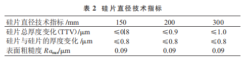 1.3.2 超精密磨削研究現(xiàn)狀 (1)硅片自旋轉(zhuǎn)磨削。采用略大于硅片的工件轉(zhuǎn)臺(tái),通過(guò)真空吸盤每次裝夾一個(gè)硅片,硅片的中心與轉(zhuǎn)臺(tái)的中心重合,杯形金剛石砂輪的工作面調(diào)整到硅片的中心位置。磨削時(shí),硅片和砂輪繞各自的軸線回轉(zhuǎn),砂輪只進(jìn)行軸向進(jìn)給。在超精密磨削中,金剛石砂輪的修整情況對(duì)零件的加工質(zhì)量有決定性影響。其修整過(guò)程主要包括修平 / 結(jié)合劑去除和去尖,修平一般采用金剛石砂輪磨削相對(duì)軟質(zhì)物質(zhì)。結(jié)合劑去除主要采 用電解法和接觸放電法。目前,采用硅片自旋轉(zhuǎn)磨削方法加工直徑 150~ 400 mm(6~16 英寸)硅片,可實(shí)現(xiàn)硅片的正面超精密磨削和背面磨削減薄,所達(dá)到的技術(shù)指標(biāo)見(jiàn)表 2。